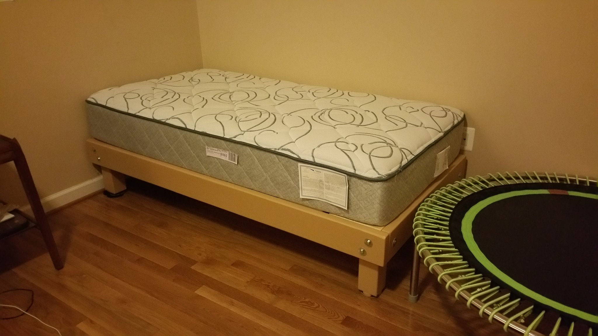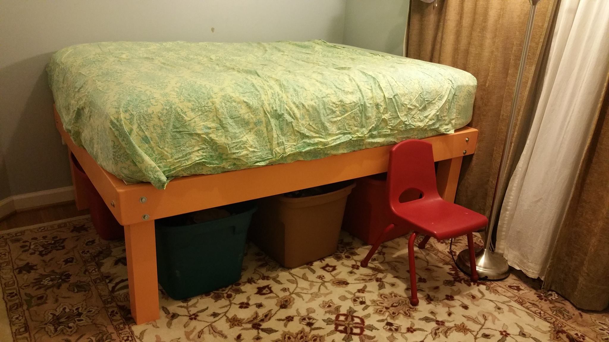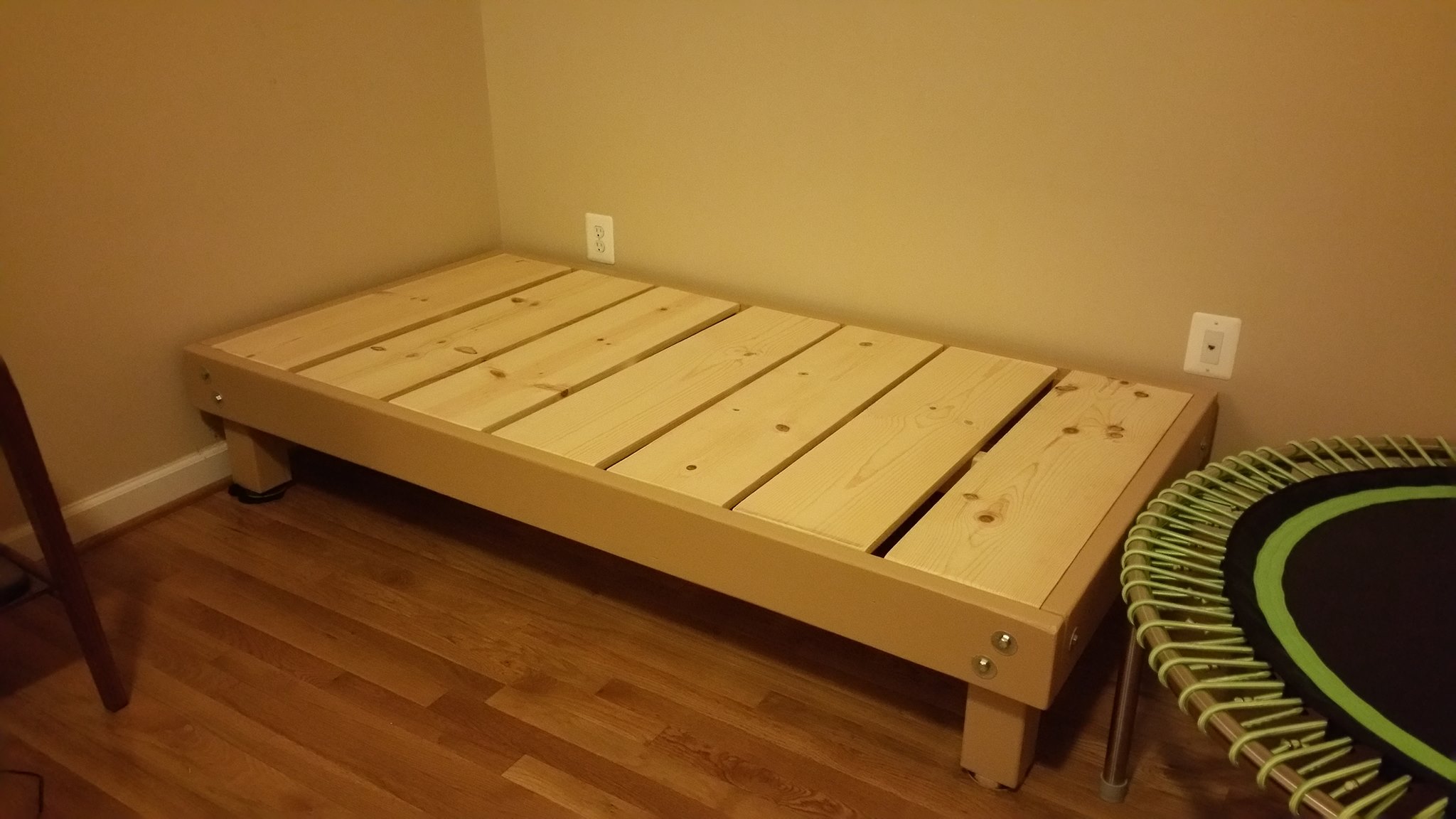This is the third one of these simple platform beds Darren and I have built. I think that building stuff relieves stress by forcing you to focus on the moment, which is probably why we have been drawn to these projects recently. This one is a twin size “daybed,” and will serve as an extra kid-sleeping or tv-watching spot in our bedroom. Only a couple more bed spots left in the house… then it’s on to yoga for stress management!