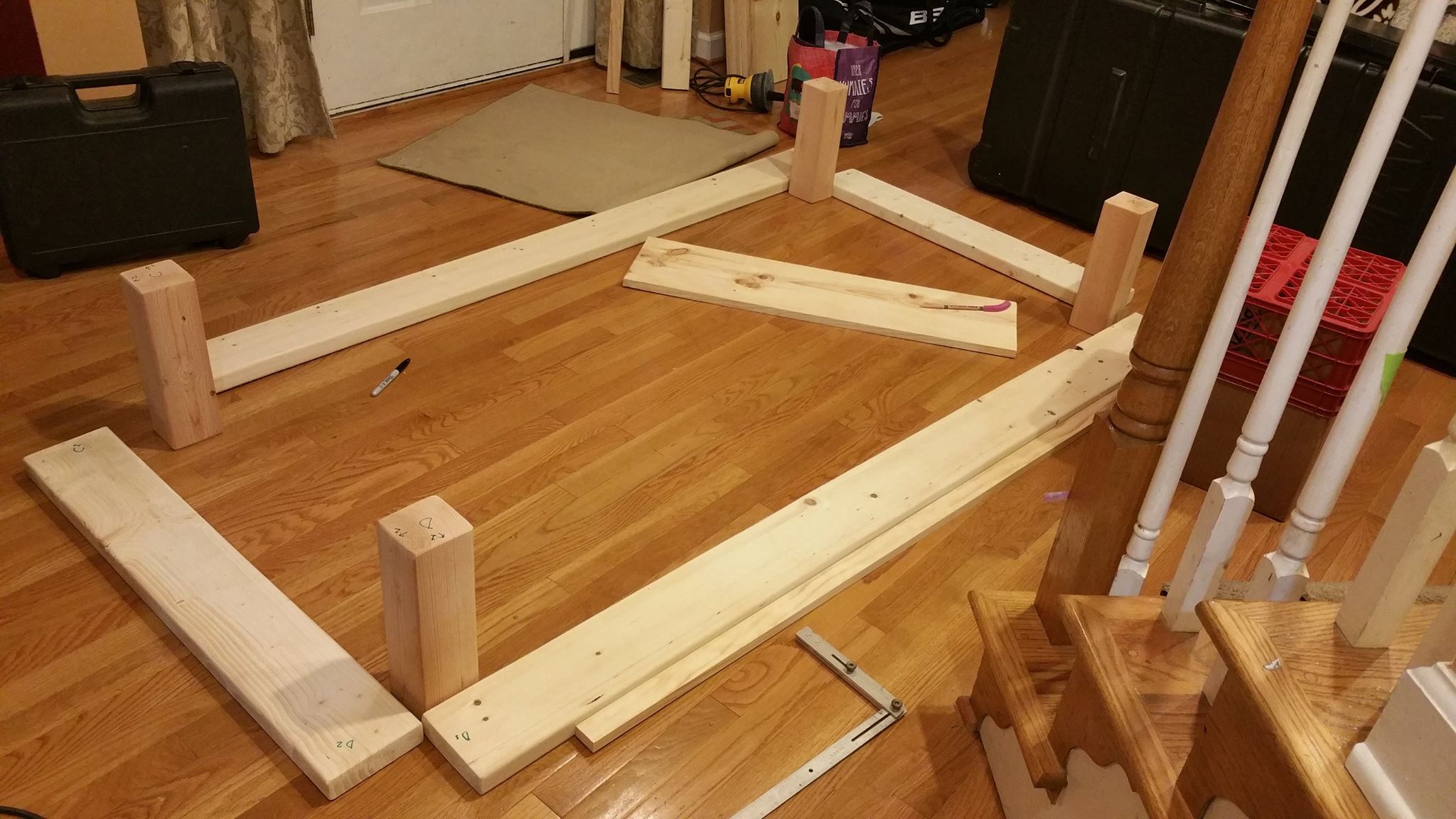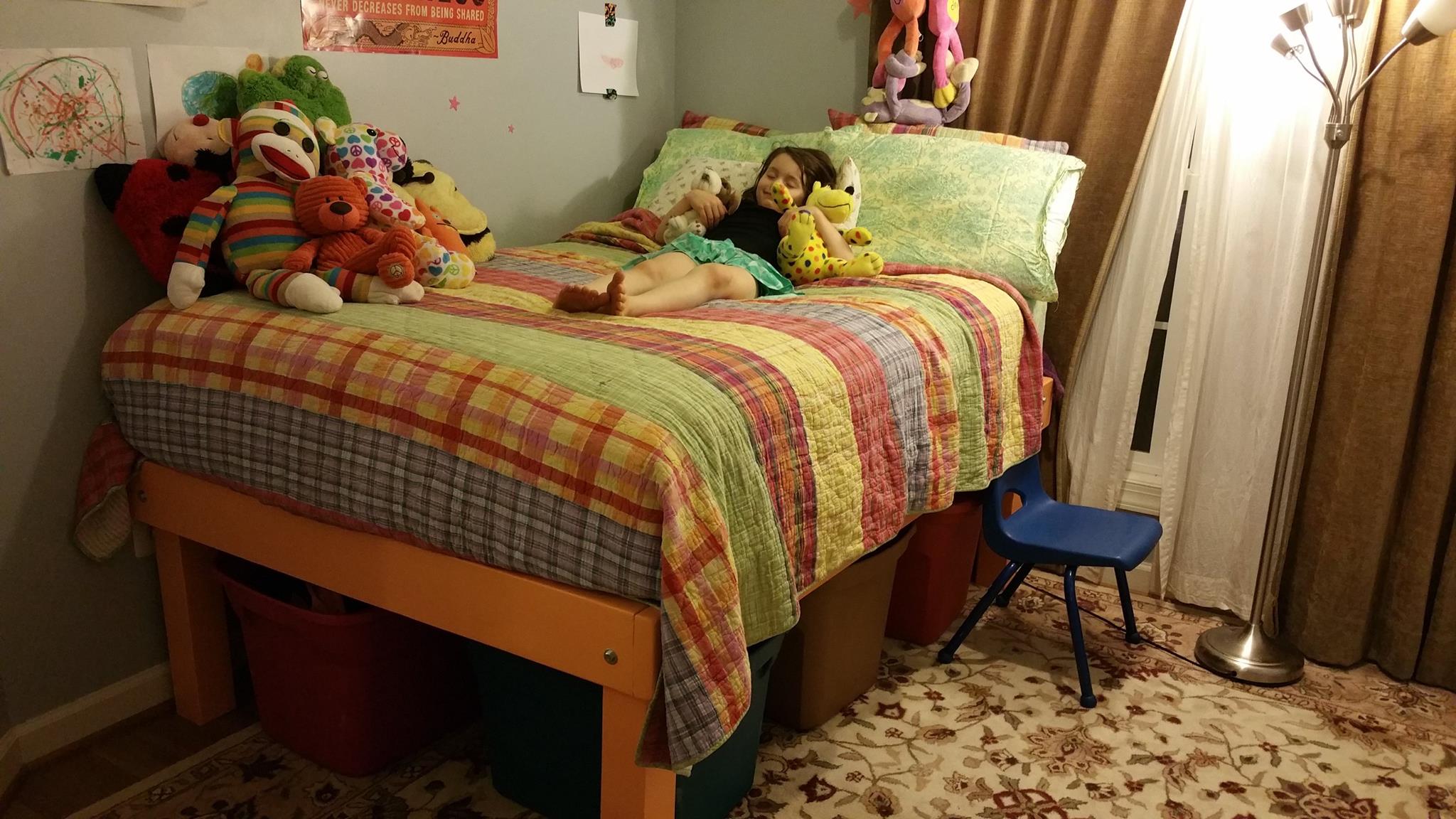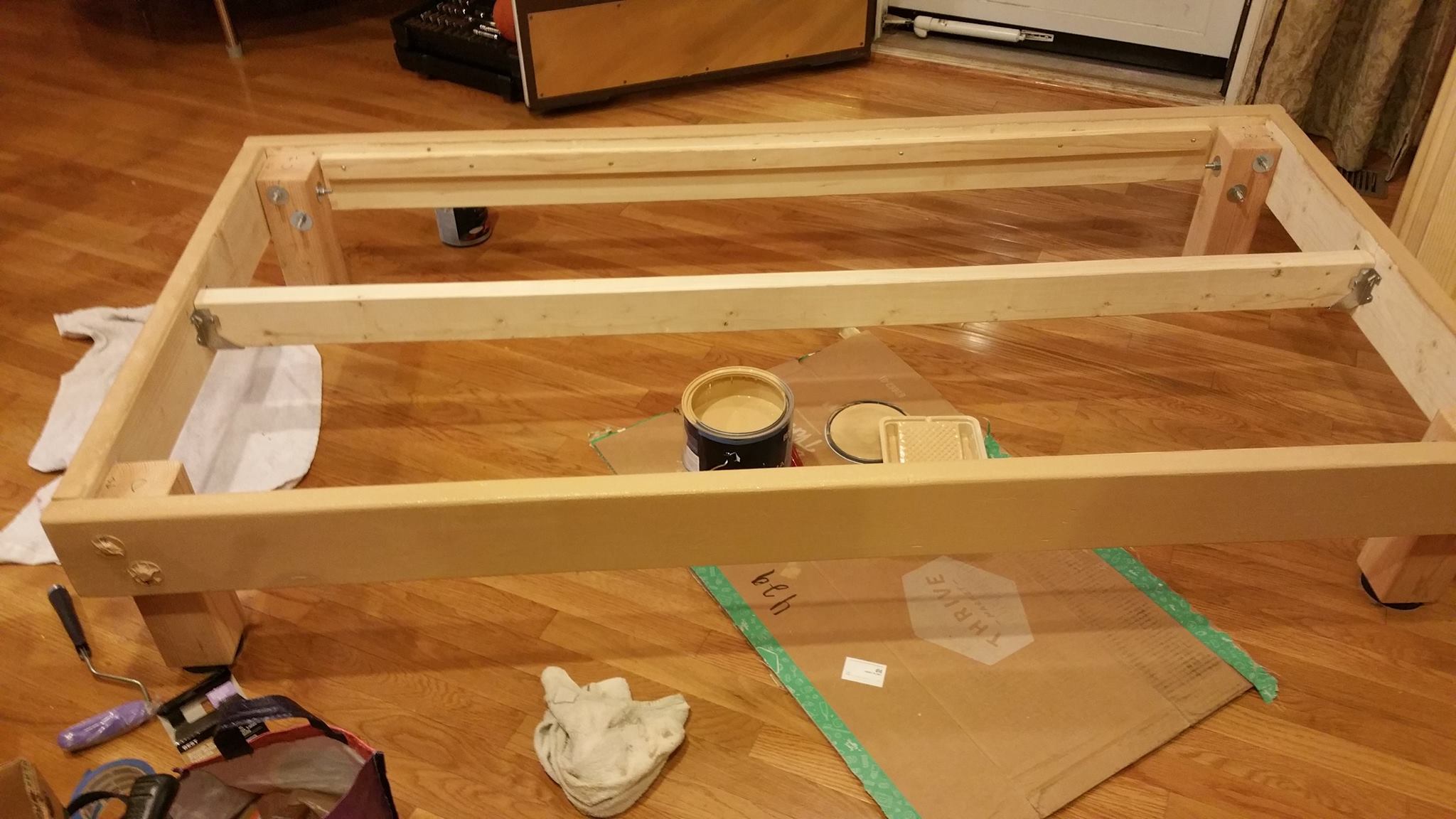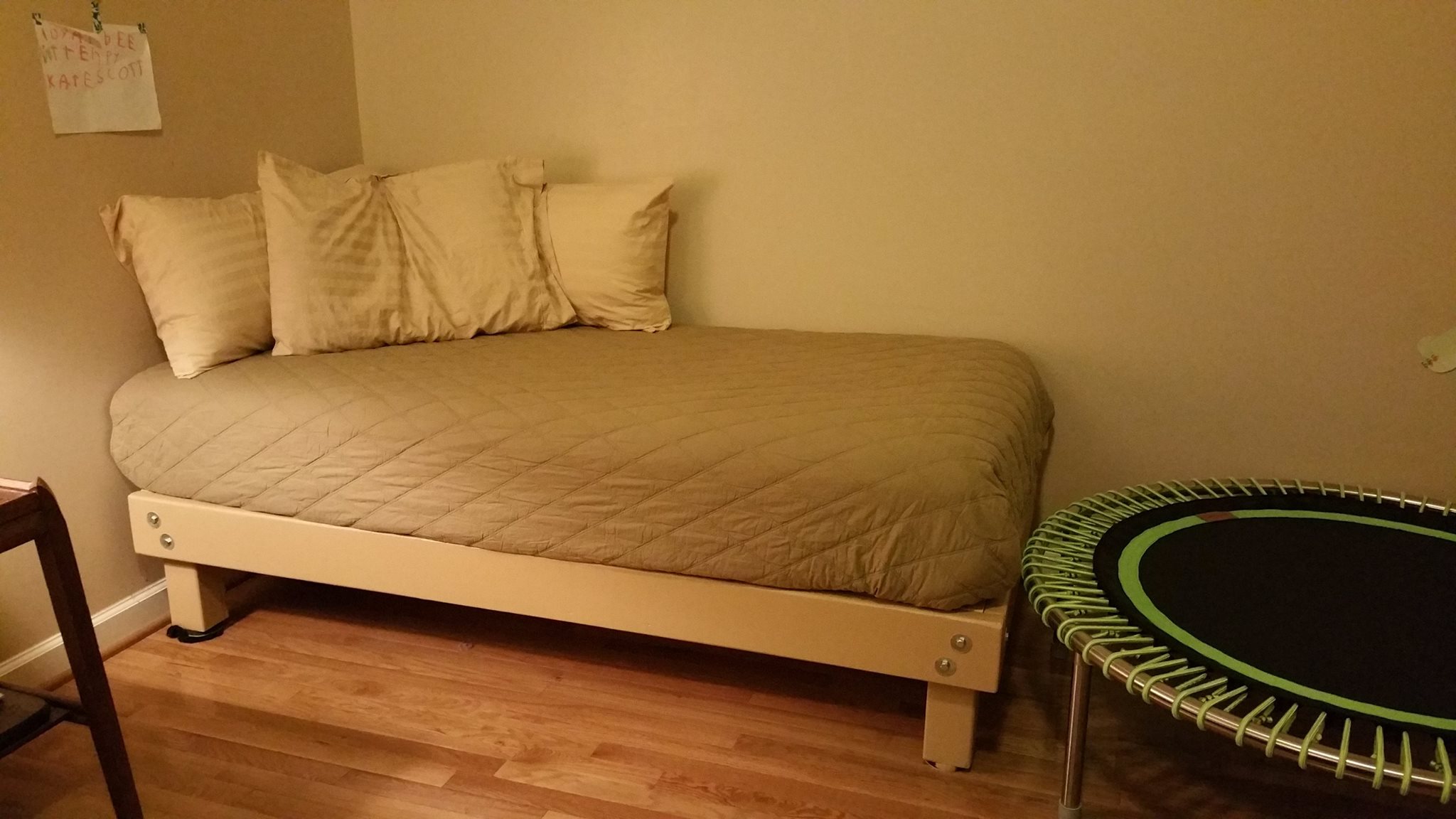 This is the third one of these simple platform beds Darren and I have built. I think that building stuff relieves stress by forcing you to focus on the moment, which is probably why we have been drawn to these projects recently. This one is a twin size “daybed,” and will serve as an extra kid-sleeping or tv-watching spot in our bedroom. Only a couple more bed spots left in the house… then it’s on to yoga for stress management!