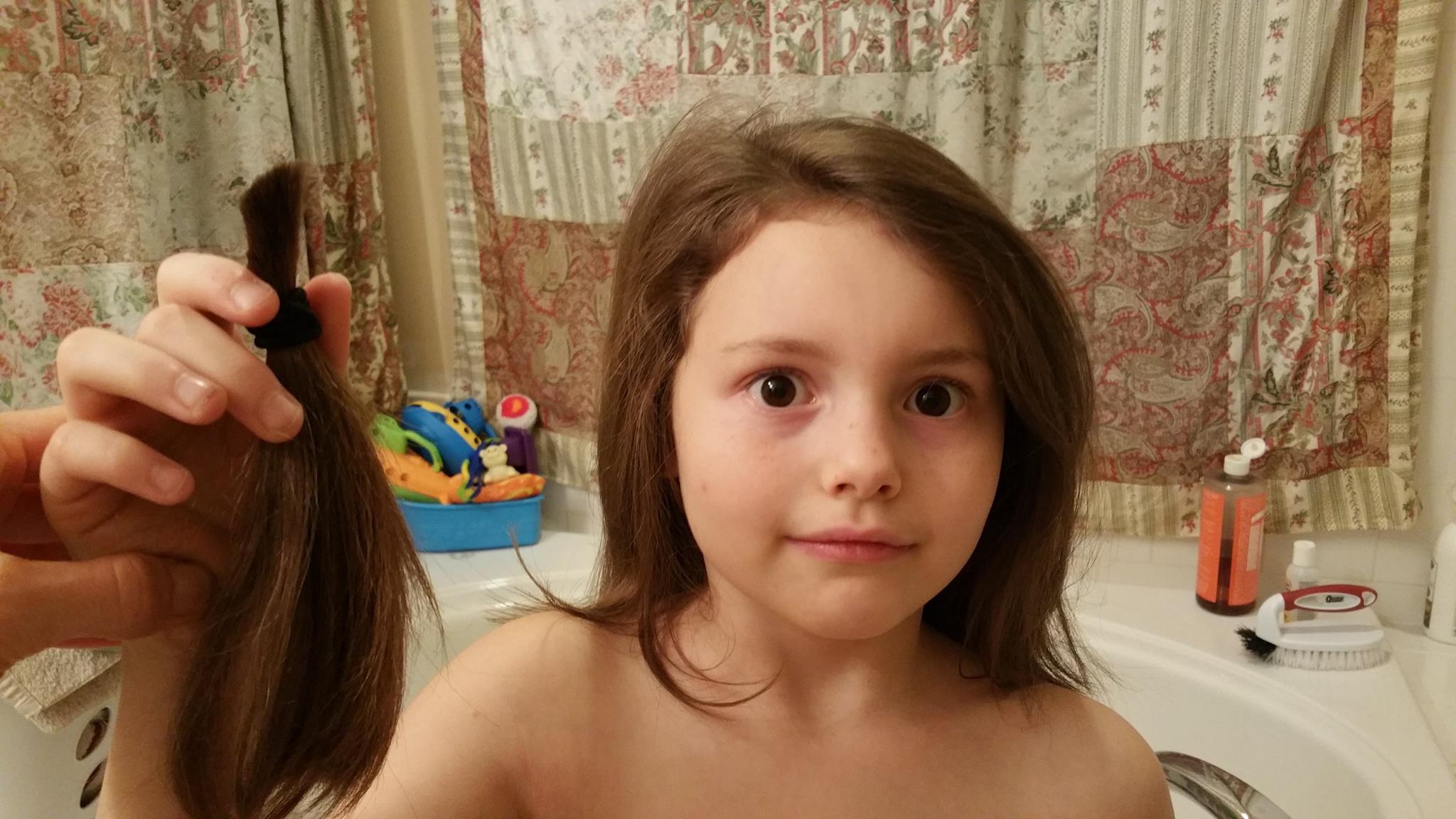 Zofia has a perpetual “rats nest” and hates having her hair brushed. Awhile ago, I mentioned that if she cut it short, it would be a lot easier to brush out, but she would have none of that. Then, in the past couple weeks, she’s started telling me that, maybe, she’d like to cut off “a little”… to her shoulders. So, despite seeming somewhat distrustful that I would cut off too much, she decided she wanted to liberate herself from the tangles (a little) and we chopped off about five inches. Thankfully, she is happy with the results. πŸ™‚